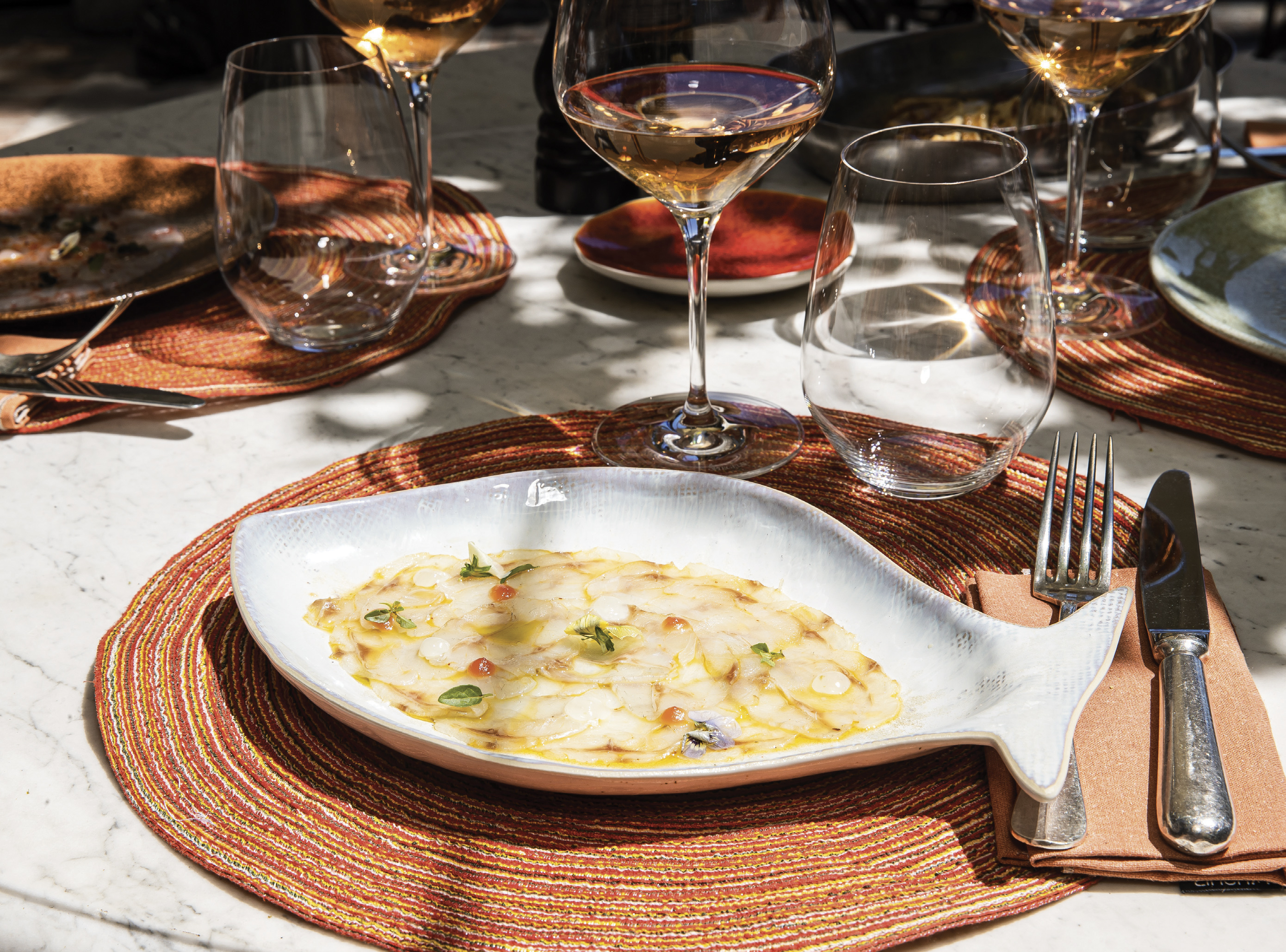 Le chef Hervé Peronnard travaille tout d’abord un poisson entier pour en tirer des filets avant de les couper en très fines tranches. Le met est ensuite apprêté avec une fine pellicule d’huile d’olive parfumée aux piments d’Espelette, plus huiles de basilic et de pépins de raisins. Le chef y ajoute des petits points de gels de citron et pamplemousse maison. La belle assiette choisie par Marie Sibuet est enfin parée d’herbes et fleurs directement cueillies dans le jardin de la Villa Marie. Afin de rester « maison » jusqu’au bout, le breuvage à assortir sera tout naturellement un Rosé du Domaine de Marie !