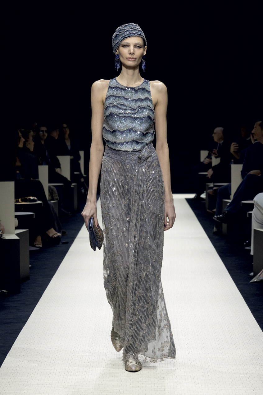 A master of understated luxury, GIORGIO ARMANI presents a wardrobe that is subtly refined and resolutely modern. Velvets, cashmeres, and jacquard silks flow through unstructured jackets, fluid coats, and impeccably tailored suits. The house’s creativity shines, as always, through the art of precious, sophisticated detailing that graces both garments and accessories with elegance.
