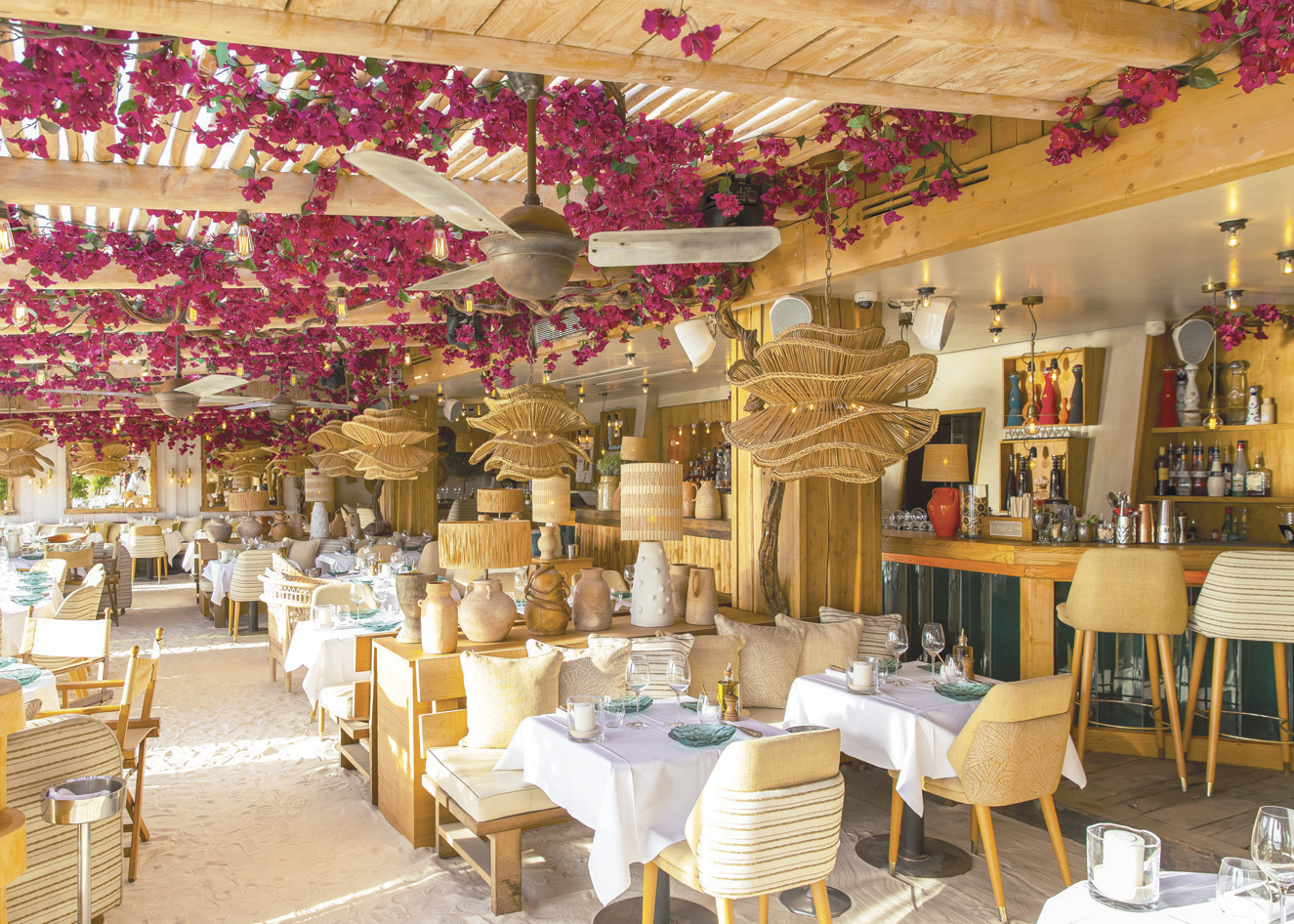 This summer, La Petite Plage Saint-Tropez reveals a brand new solar and refined setting lulled by the light, live music and festive spirit of Saint-Tropez. The natural materials insufflate warm colours and sunset-inspired tones to rhythm the space. The bar is dressed in natural canes, while bamboo blinds dim the light at sunset, as the evening comes alive… This architectural transformation accompanies the arrival of a new Mediterranean-inspired sharing menu, imagined by chef Eric Frechon, « Meilleur Ouvrier de France » and rewarded with the « Légion d’Honneur ».