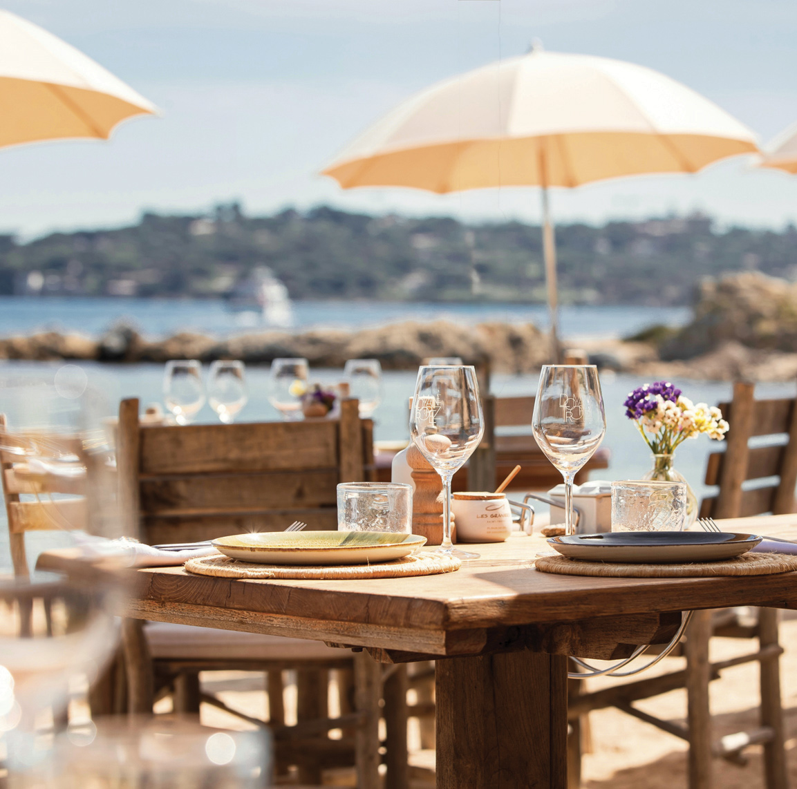 A gem of natural elegance and discretion, Les Graniers invites you to savor every moment with your feet in the sand, in the heart of Saint-Tropez, nestled in a cove lined with umbrella pines and facing the sea. Wood-fired grilled fish and meats, lobster and crayfish pasta, and light dishes—each offering from the menu is enjoyed in a warm and convivial atmosphere. From June onwards, sunset aperitifs and dinners under the stars extend this truly divine experience.