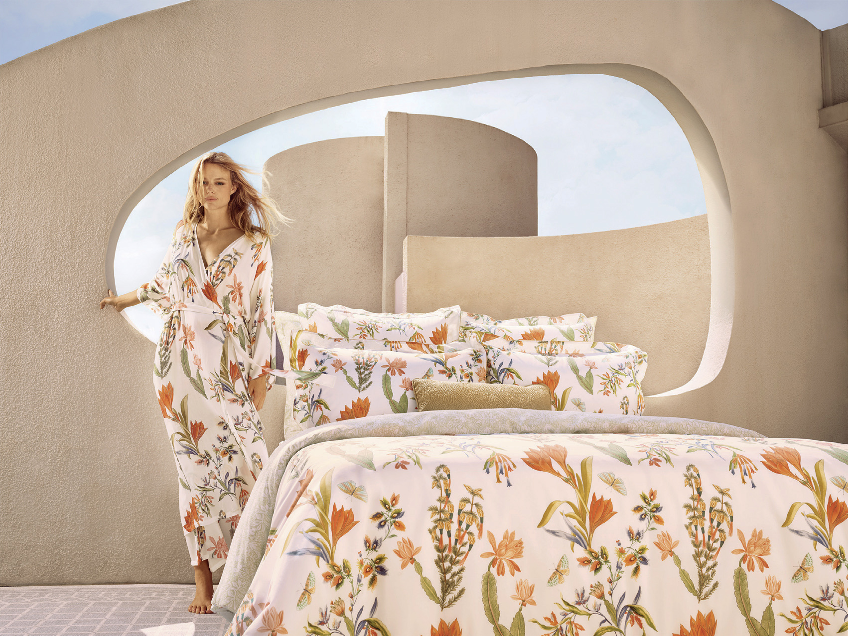 Avec Midi Solaire, sa collection Printemps-Été 2026, Yves Delorme explore un imaginaire méditerranéen baigné de lumière, de chaleur et de contrastes. Le dessin EZE évoque un jardin exotique de la Côte d’Azur, entre fleurs lointaines et cactées, dans une composition aérienne imprimée sur batiste de coton. Une expression fraîche et lumineuse de l’art de vivre selon Yves Delorme.